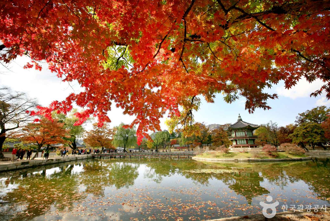 ソウルで紅葉を楽しむなら、まず外せないのが景福宮(경복궁)。朝鮮王朝の中心として歴史を刻むこの王宮は、秋になると伝統建築の背景に紅葉が映え、まるで時代劇のワンシーンのようです。特に勤政殿(근정전)や香遠亭(향원정)周辺は人気の撮影スポット。韓服(한복)をレンタルして歩けば、韓国の歴史と秋の風景を同時に体感できます。