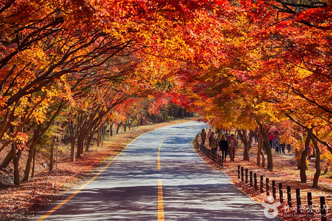 内蔵山(내장산)は韓国でも屈指の紅葉の名所として知られ、「秋に一度は訪れるべき場所」と言われるほど。標高763メートルの山全体がカエデで覆われており、10月下旬から11月上旬にかけて真っ赤に染まります。中腹にある内蔵寺(내장사)へ向かう参道は、紅葉のトンネルとして有名で、風が吹くたびに木の葉が舞い落ちる様子はまるで映画のワンシーンのよう。山頂からは全羅北道の山々が一望でき、ケーブルカーでの空中散歩も楽しむこともできます。